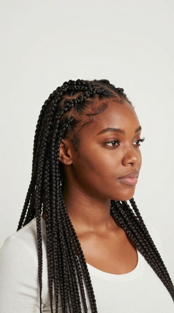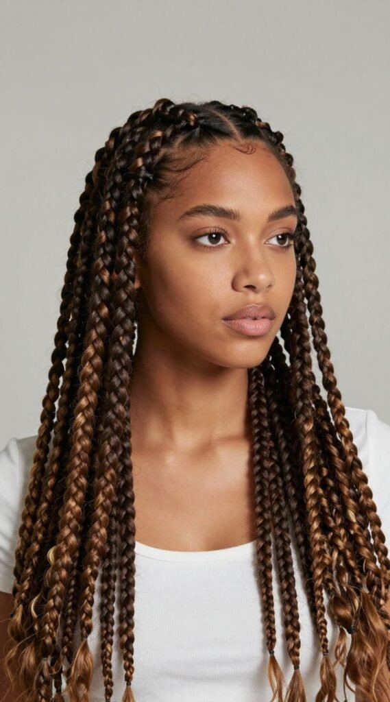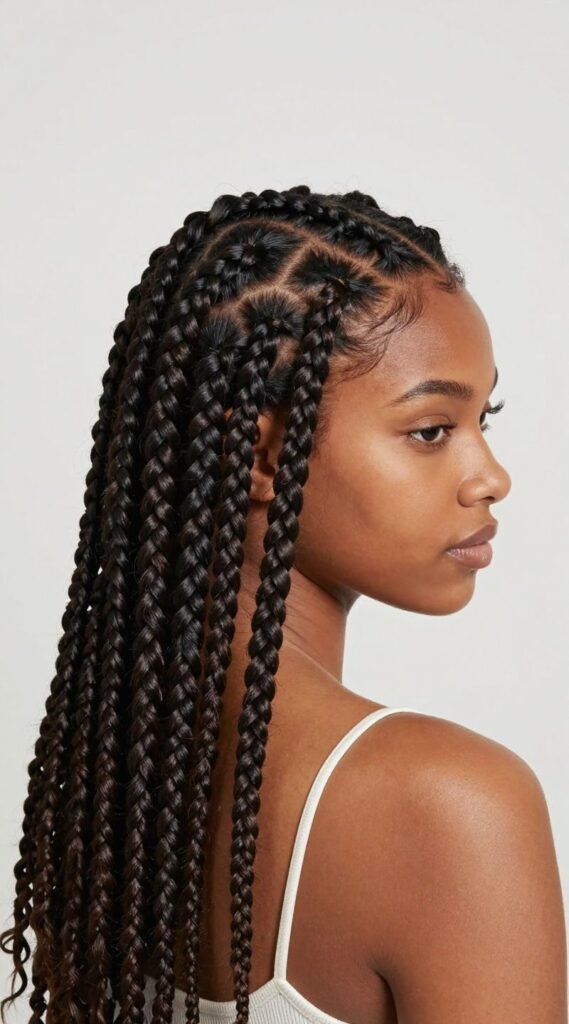 If you’re short on time but big on style, jumbo braids are your go-to. These thick, bold braids make a serious statement and get installed much faster than their smaller counterparts. Think chunky box braids or large cornrows.
