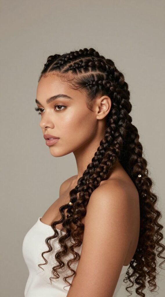 Goddess braids are essentially jumbo cornrows, often styled with a softer, more romantic touch. They usually feature thicker sections and can be adorned with cuffs or left with curly ends for extra pizzazz. They’re elegant and bold.