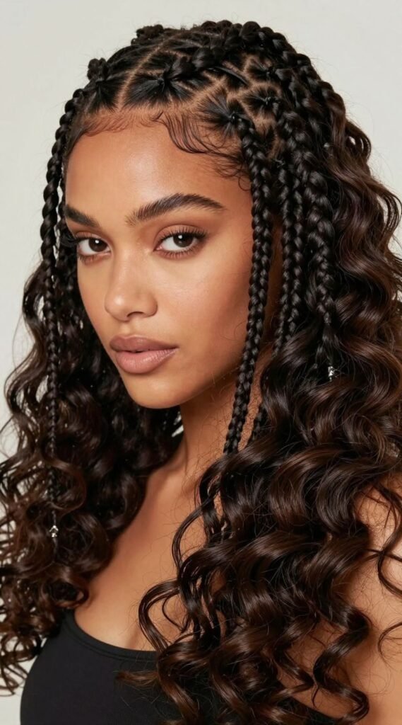 The magic happens when those braids seamlessly transition into a voluminous, bouncy weave. Think big, beautiful curls that scream ‘I woke up like this’ (even if you spent an hour perfecting it). It’s the ultimate blend of street style and red carpet glam.