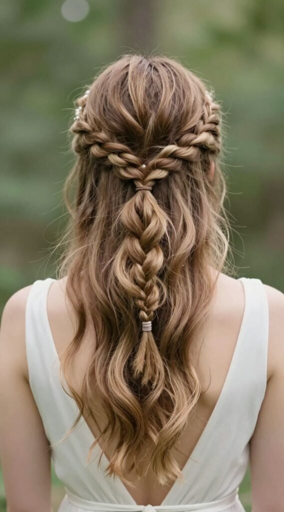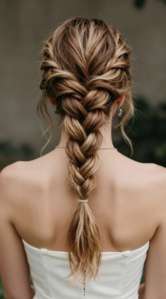 It’s a little more involved but totally worth the effort for that relaxed, festival-chic vibe. Pro tip: Don’t strive for perfection; a slightly messy, “lived-in” fishtail is the goal. This style works because it’s unique, eye-catching, and perfectly complements a more laid-back or rustic wedding theme.