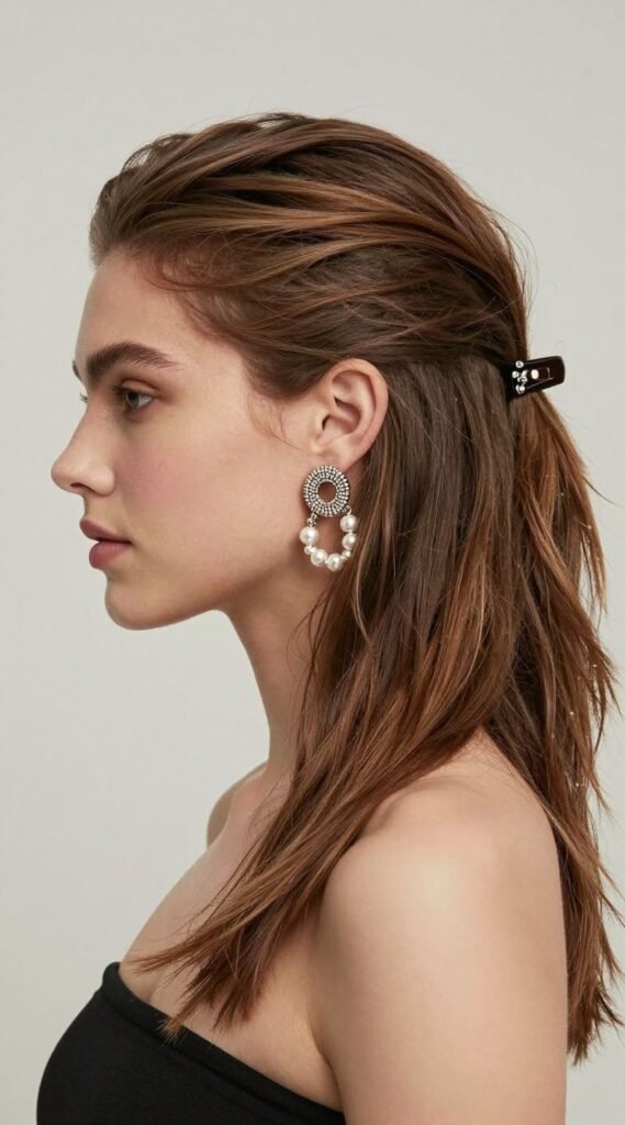 Take one side of your hair, sweep it back, and secure it with a pretty clip or pin, letting the rest of your hair fall over your shoulder. It’s asymmetrical chic.