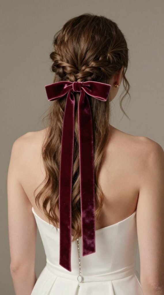 Sometimes, the simplest accessories make the biggest impact. Secure your half-up style with a chic velvet ribbon tied in a bow or simply woven through a small braid.