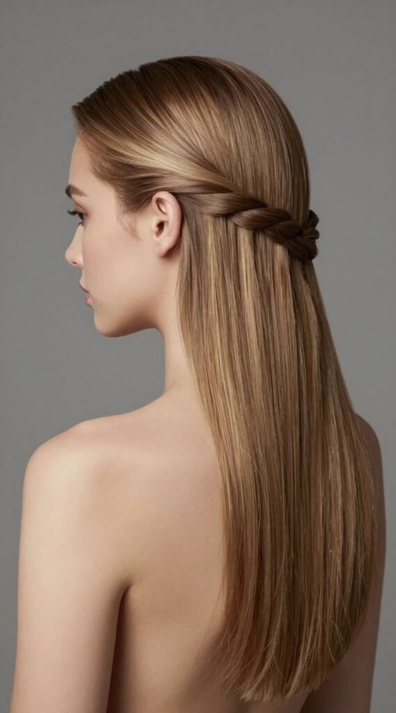 Who said half up half down can’t be ultra-modern? Pull back the top section smoothly, leaving the rest of your hair poker-straight and gleaming. It’s minimalist chic at its finest.