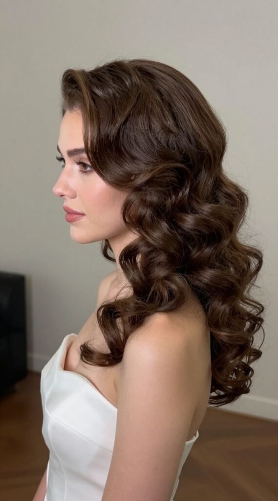It’s perfect for adding drama and a touch of old Hollywood glam to your ensemble. Pro tip: Curl your hair away from your face for a flattering, face-framing effect, and don’t be shy with the hairspray. This style works because it’s undeniably glamorous and makes a statement without overshadowing the bride (obviously).