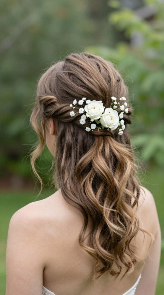 If the wedding has a garden vibe, lean into it! Tuck a few small, fresh flowers or delicate silk blooms into the secured section of your half-up ‘do. Think baby’s breath or small roses.