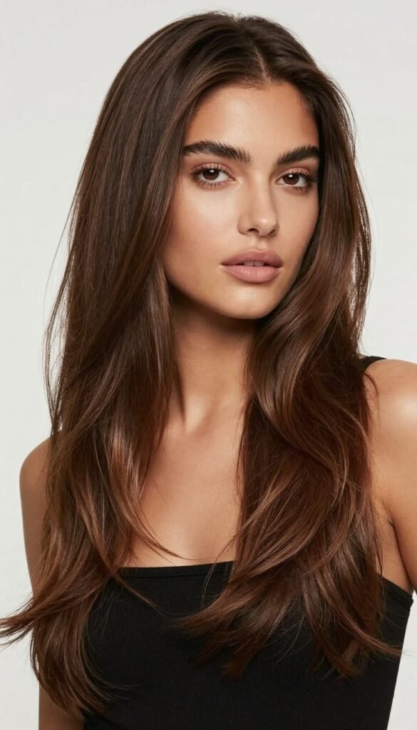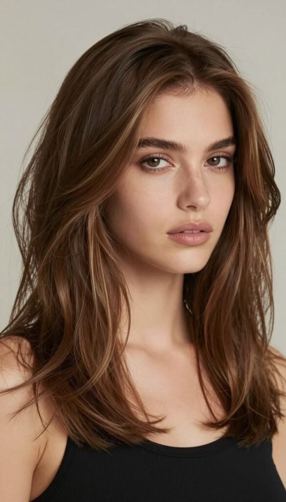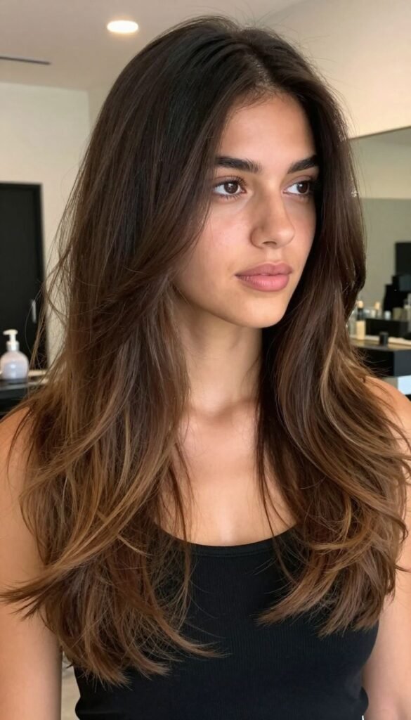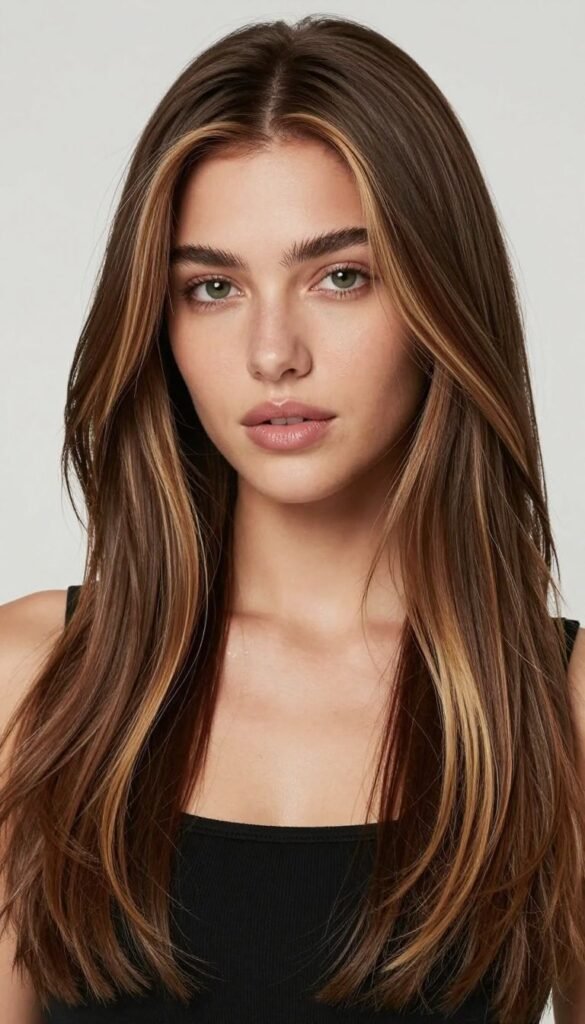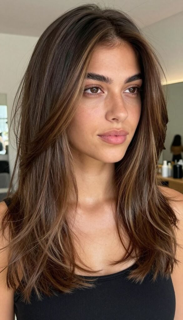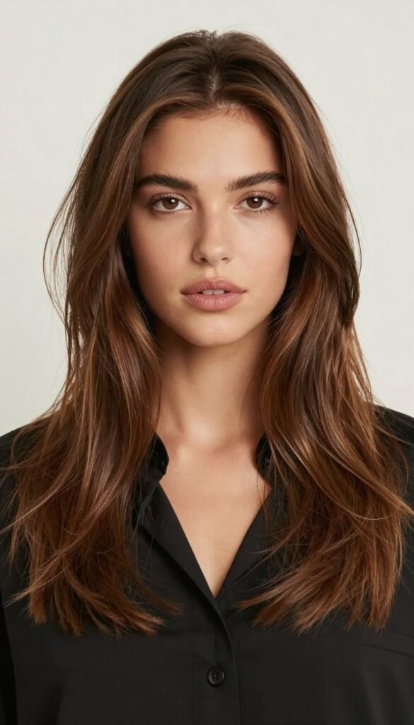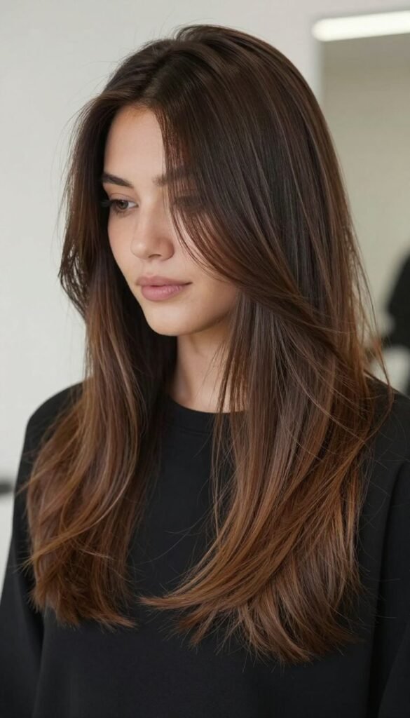 Babylights add incredible dimension and a soft luminosity without ever looking artificial. Pro Tip: Ask for them to be concentrated around your part and hairline for the most natural sun-kissed effect. This technique makes your dark brown hair shimmer with a subtle warmth, like it’s perpetually bathed in golden hour light.