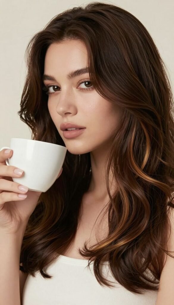 The contrast is striking yet incredibly cohesive, making your hair look multi-dimensional and vibrant. Pro Tip: Ask for a mix of fine and medium caramel pieces to truly mimic that swirling coffee effect. Itโs a deliciously rich combination that adds a sophisticated twist to your usual dark brown.