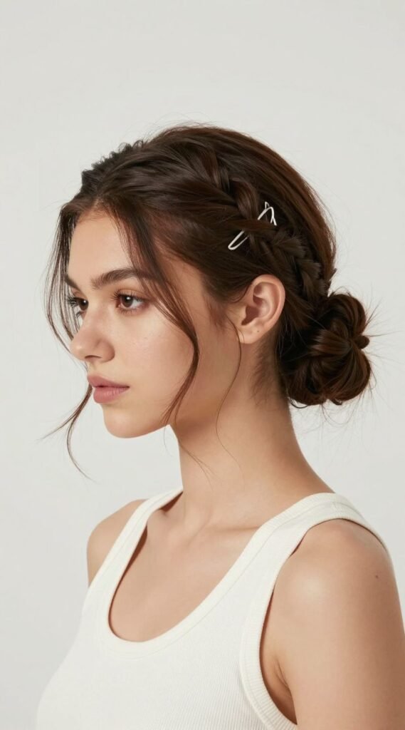 Feeling a little bohemian? Take two small sections from the front, braid them, and then cross them at the back, securing with pins. It’s like a tiny, adorable crown for your head.
