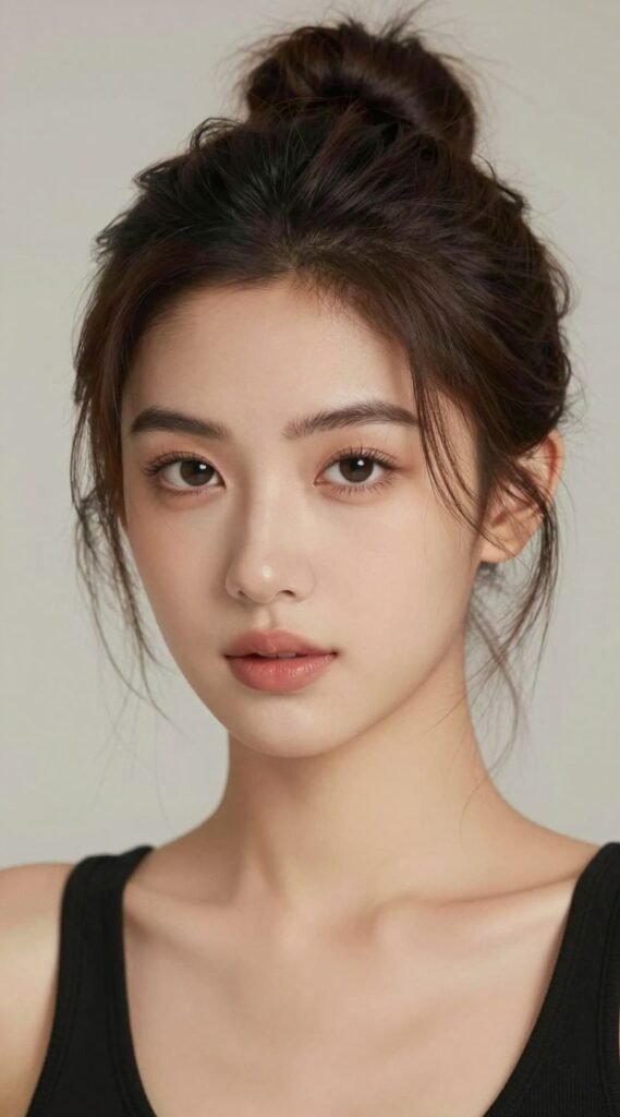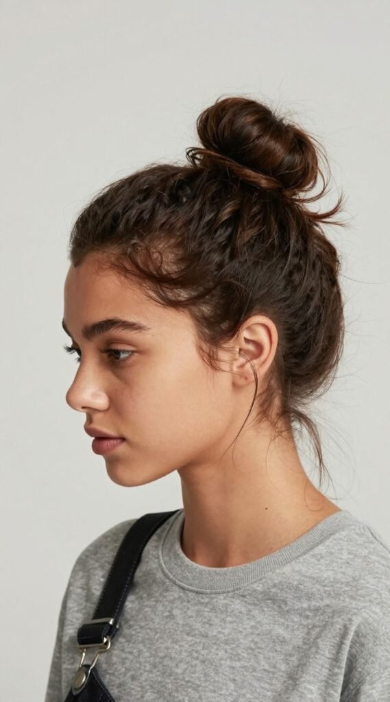Channel your inner cool girl with this laid-back style. Pull the top half of your hair into a casual, slightly messy bun right at the crown. It’s the “I definitely tried but also didn’t really care” look.