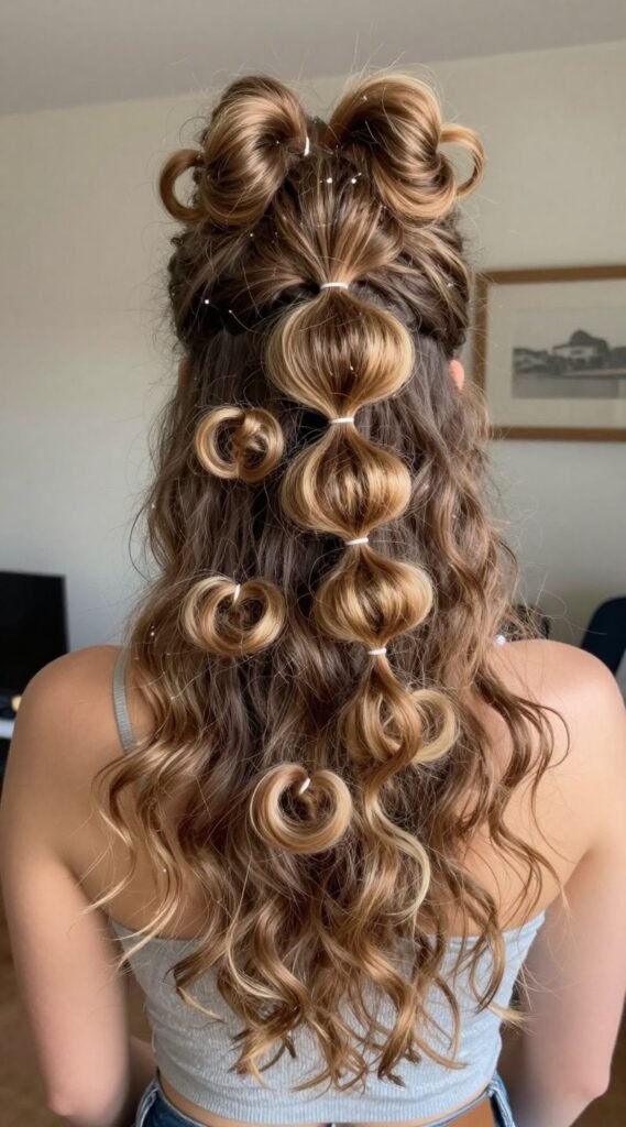 This one is pure fun and surprisingly easy. Create a half-up ponytail, then add elastics down the length, puffing out each section to create “bubbles.”