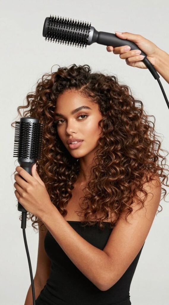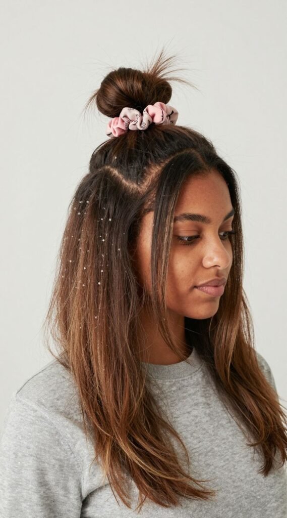 Can’t decide between up or down? Why not both? This playful yet polished style lets you show off your length while keeping some hair out of your face. It’s perfect for casual days or dressed-up nights. Gather the top section of your hair, including your leave out, and secure it with a cute scrunchie or hair tie. This style just works because it’s the ultimate combination of fun and functional, giving you two looks in one.