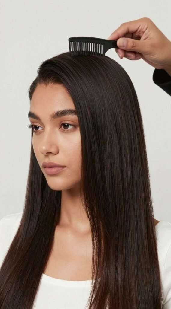Pro tip: Use a tiny bit of strong-hold gel on your roots and a fine-tooth comb to banish any flyaways. It’s all about that mirror-like finish, darling.