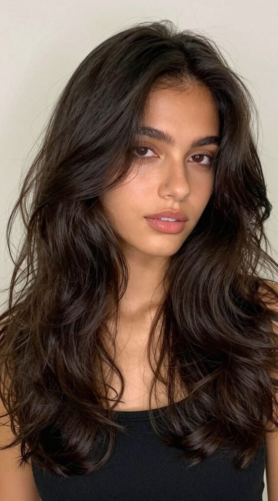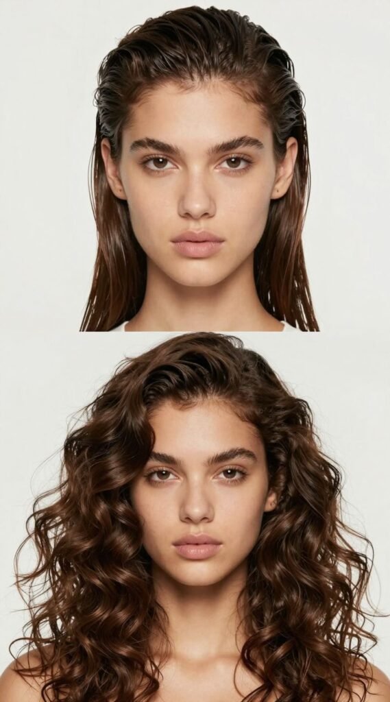 Embrace your natural texture or create some intentional volume for the “down” part of this look. The contrast between the ultra-smooth top and the wild, free-flowing bottom is incredibly striking.